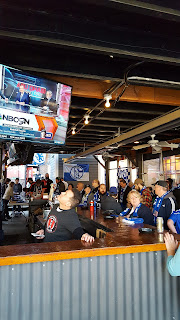 This morning, it was time for beer and soccer on TV at Amsterdam Tavern (http://amsterdamtavern.com/) in south St. Louis. I joined with other FC Schalke 04 (https://schalke04.de/en/) supporters as that team played Borussia Dortnumd in the Reveirderby in Germany. We enjoyed a free German breakfast--sausage and sauerkraut on a bun--and beer as we watched the match on TV. There was despair at first, as Dortmund jumped to a 4-0 lead in the first half. However, Schalke came back to score four second-half goals--two after a Dortmund player was sent off for his second caution of the match--and this ended in a 4-4 draw. I saw one of my fellow St. Louligans (http://stlouligans.com/), Kate, in the rather crowded bar.