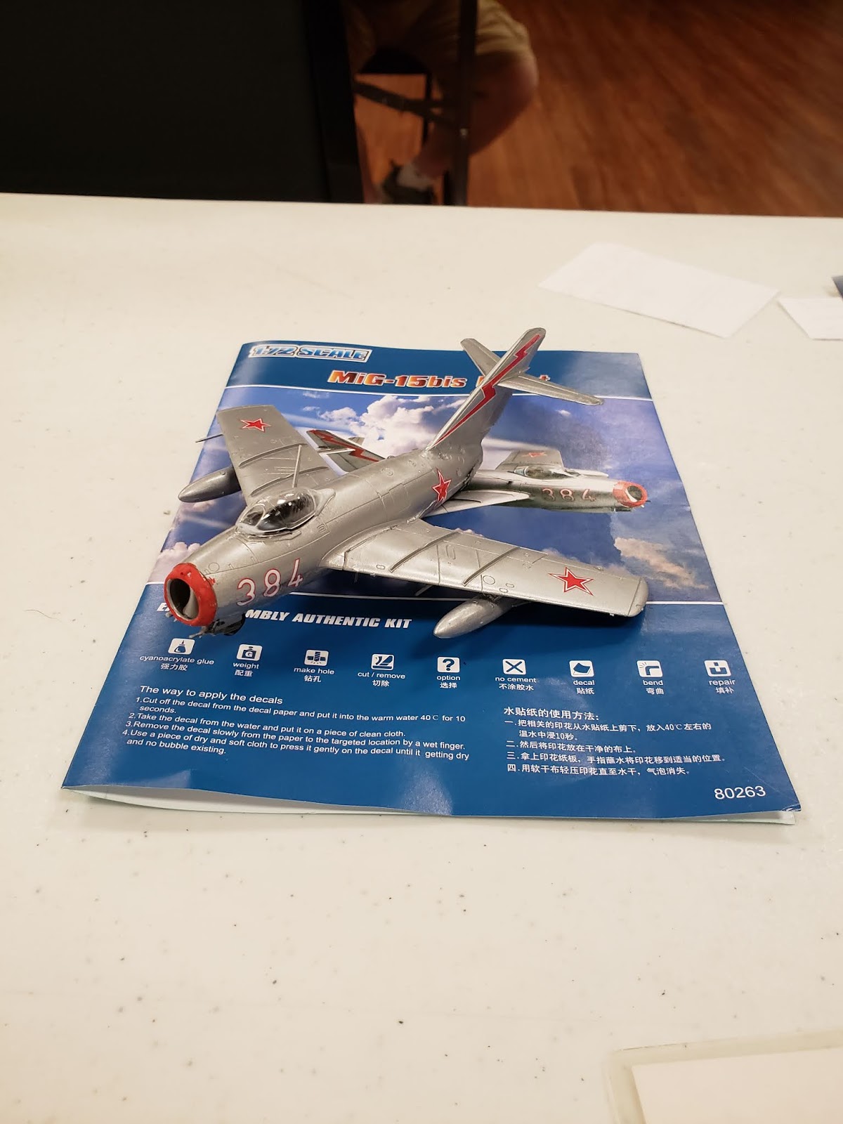 I brought a Hobby Boss (http://www.hobbyboss.com/) 1:72 scale MiG-15bis kit that I bought the previous Saturday from Schaefer's Hobby Shop (http://schaeferhobby.com/). Promptly at 7:00 pm, SlamFest began. The kit was rather simple to assemble, and the color scheme (overall natural metal) was simple.